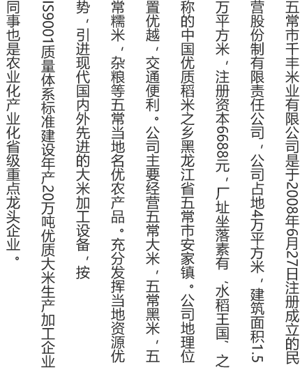 五常市千豐米業有限公司是于2008年6月27日注冊成立的民營股份制有限責任公司